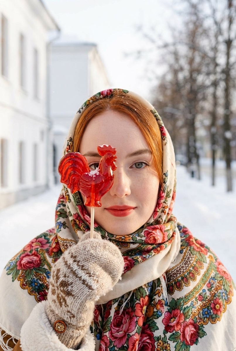 Cinematographic lighting. A woman on the winter street is holding a caramel rooster on a stick in her hand. She covers one eye with them, like peeping. She is wearing a traditional scarf with a floral pattern framing her face, and warm knitted mittens with an ornament. There is a light red lipstick on the lips, the look is soft and warm, the background is slightly blurred, with cold winter
