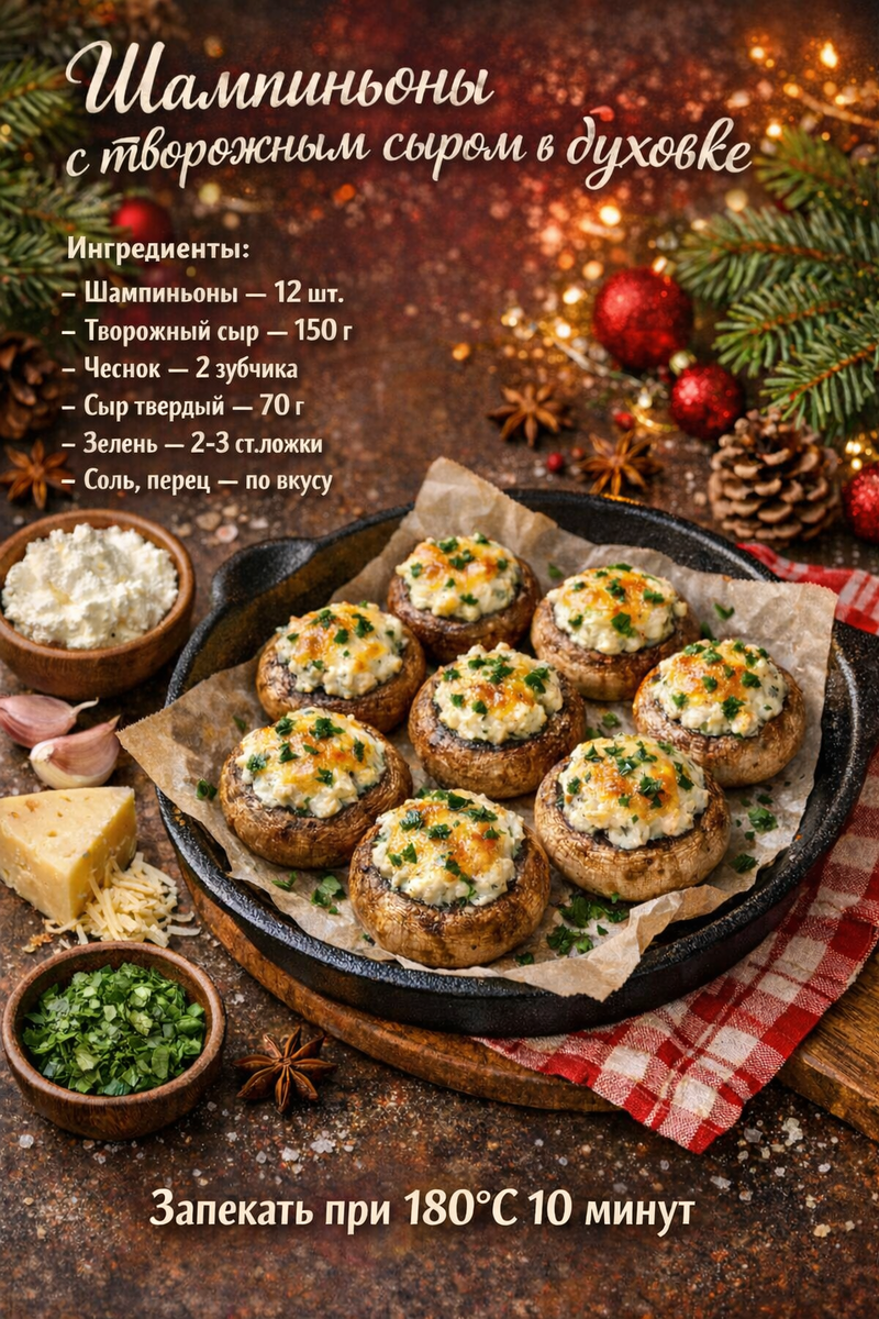 Новый год уже на пороге, а значит, время приготовить вкусные и сытные закуски! Сегодня делимся рецептом невероятно вкусных Шампиньонов с творожным сыром в духовке. Эта закуска идеально подойдет для праздничного стола и станет настоящим хитом на вашем вечере!