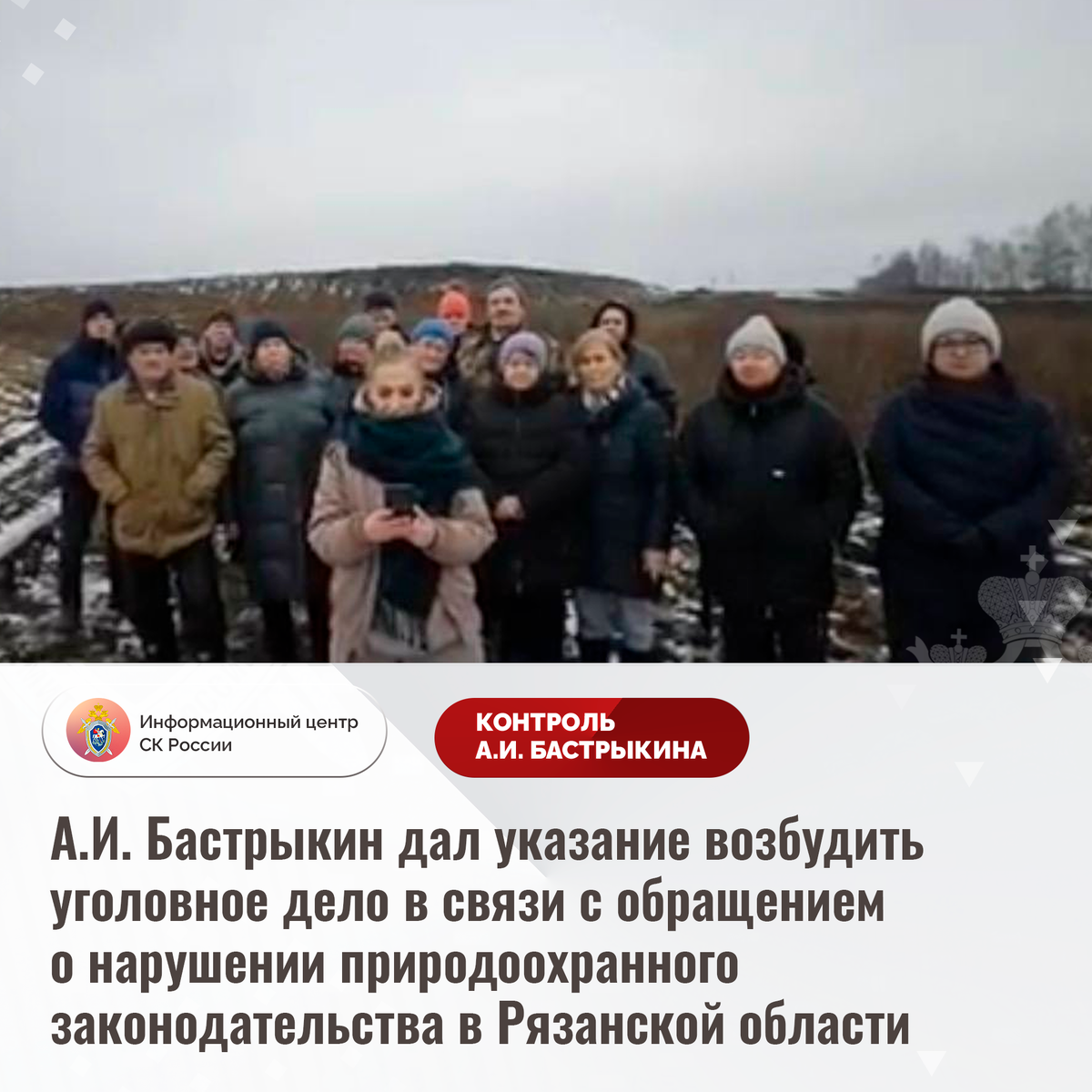 А.И. Бастрыкин дал указание возбудить уголовное дело в связи с обращением о нарушении природоохранного законодательства в Рязанской области В комментариях в социальной сети СК России опубликовано видеообращение жителей Рязанской области по вопросу нарушения природоохранного законодательства в Захаровском районе. Более года вблизи населенных пунктов организован полигон для хранения отходов четвертого класса опасности. Из-за тления биологических материалов местные жители ощущают резкий неприятный запах. Граждане опасаются возникновения заболеваний дыхательных путей и попадания токсичных веществ в грунтовые воды. Многочисленные обращения в различные инстанции результатов не принесли. В СУ СК России по Рязанской области организована процессуальная проверка. Председатель Следственного комитета Российской Федерации Александр Иванович Бастрыкин дал указание руководителю СУ СК России по Рязанской области Олегу Алексеевичу Васильеву возбудить уголовное дело и представить доклад о предварительн