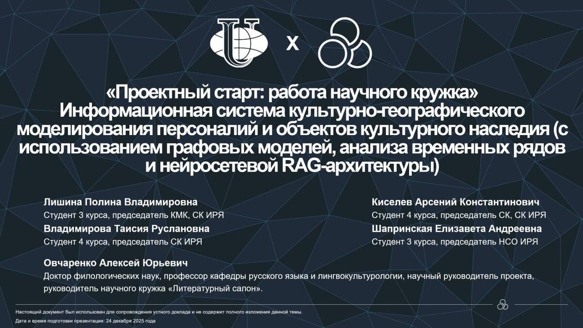 😋«Проектный старт: работа научного кружка» В проекте приняли участие: 1️⃣ Лишина Полина Владимировна, Студент 3 курса, председатель КМК СК ИРЯ, руководитель проекта. 2️⃣ Владимирова Таисия Руслановна, Студент 4 курса, председатель СК ИРЯ, исследователь по данным и графовым моделям. 3️⃣ Киселев Арсений Константинович, Студент 4 курса, СпортКома СК ИРЯ, разработчик интерфейса и визуализации. 4️⃣ Шапринская Елизавета Андреевна, Студент 3 курса, председатель НСО ИРЯ, контент-аналитик. 🙂↕️На конкурсе был представлен междисциплинарный проект — интеллектуальная информационная система культурно-географического моделирования, направленная на развитие технологий управления знаниями в гуманитарных науках. 🙂↕️Проект объединяет методы графового анализа, моделирование временной динамики и нейросетевые подходы на основе архитектуры retrieval-augmented generation (RAG). Команда проекта выражает искреннюю благодарность научному руководителю, доктору филологических наук, профессору кафедры русс