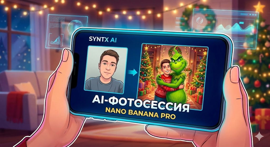 Дух Рождества уже вовсю гуляет по сети, и если вам кажется, что для крутых праздничных кадров обязательно нужен фотограф, аренда студии и свитер с оленями - у меня для вас отличные новости. Сейчас все это можно организовать, не вставая с дивана, при помощи нейросетей. Сегодня разберем, как создать реалистичную фотосессию, где вы обнимаетесь с Гринчем или позируете среди горы подарков, используя одну из самых мощных моделей на рынке. Для работы нам понадобится SYNTX AI - это, пожалуй, самый удобный агрегатор нейросетей, где в одном месте собраны все топовые инструменты. Нас интересует модель Nano Banana Pro. Она выдает потрясающую детализацию и очень бережно относится к чертам лица, что критично для персональных фотосессий. Это настоящая находка для тех, кто хочет получить голливудскую картинку, не мучаясь с настройками сложных моделей. Первое и самое важное правило: качество результата на 80% зависит от вашей исходной фотографии. Нейросети гораздо проще работать, если вы загрузите че