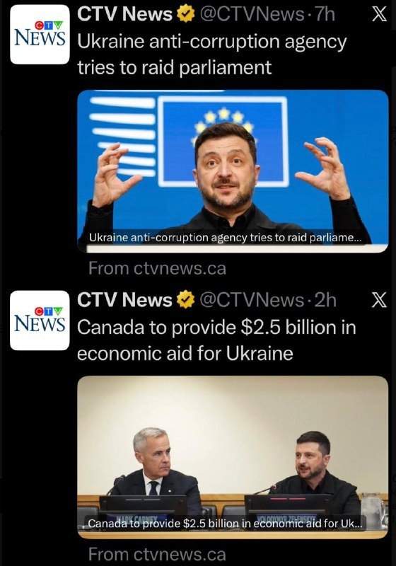 Местное ТВ вчера за пять часов успело сообщить две очень разные новости: 1. В Украине антикоррупционное агентство расследует масштабную коррупцию в парламенте, да еще и во фракции самого Зеленского! 2. Премьер Канады Марк Карни выделил Украине новую помощь – целых 2,5 миллиарда канадских долларов. Совпадение? Или все же взаимосвязанные события, как думаете? 🤔 Подписывайся