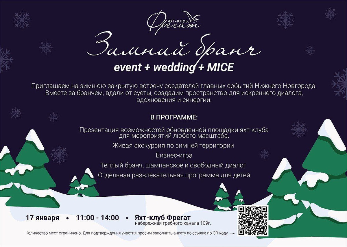"☕️ #17января2026 #НижнийНовгород #офлайн ⏰ 11:00-14:00 📍 Яхт-клуб Фрегат, Набережная гребного канала 109г ❗️ Регистрация Приглашаем на зимнюю закрытую встречу создателей главных событий Нижнего Новгорода. Вместе за бранчем, вдали от суеты, создадим пространство для искреннего диалога. В программе: — Презентация возможностей обновленной площадки яхт-клуб для мероприятий любого масштаба — Живая экскурсия по зимней территории — Бизнес- игра — Теплый бранч, шампанское и свободный диалог — Отдельная развлекательная программа для детей 📌 Добавить в Google Календарь Афиша профессиональных мероприятий для ивентеров МероПриятели! ВК https://clc.to/oiKisw Дзен https://clc.to/P6N_4A
