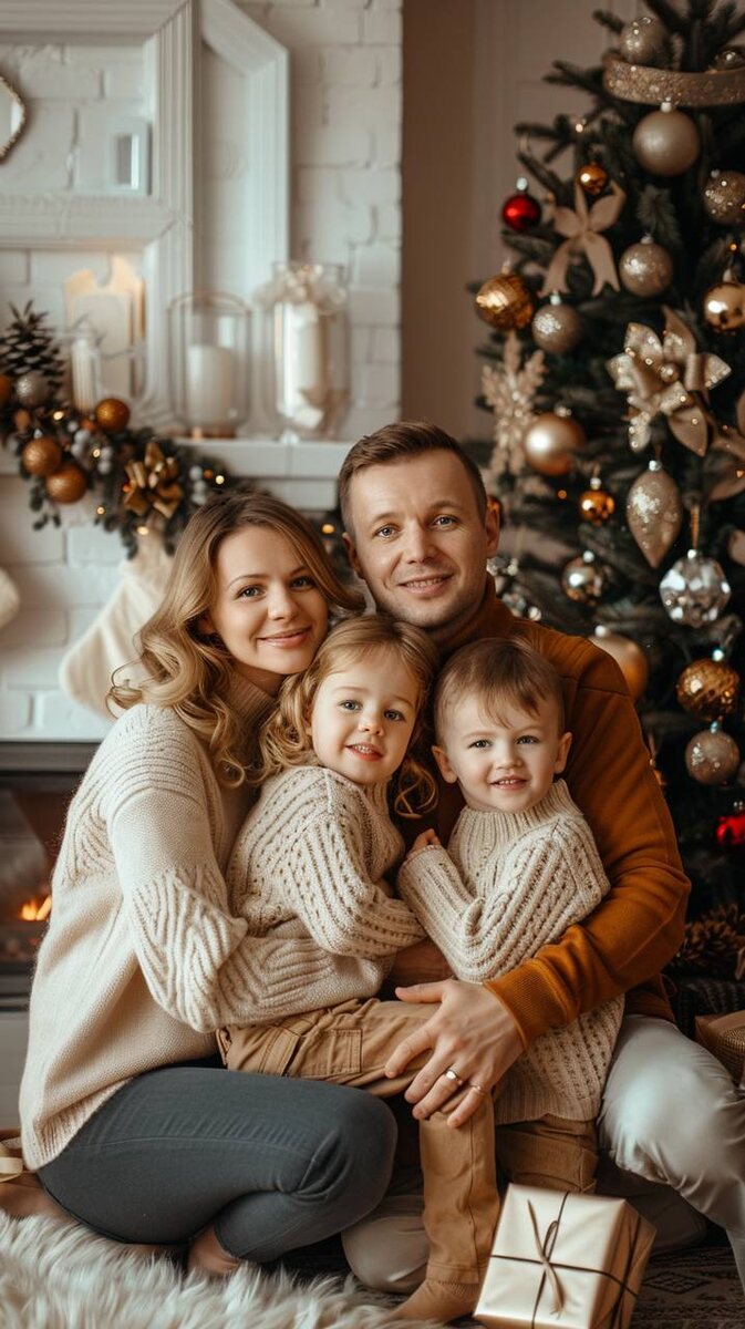 , аккуратная праздничная одежда (свитера крупной вязки, спокойные красно‑зелёно‑бежевые тона), мягкие живые эмоции, взгляд в камеру, фотореализм. Большая ёлка справа в кадре, золотые и красные игрушки, гирлянды тёплого белого света, на полу подарки в крафтовой бумаге с лентами, камин/свечи на фоне, лёгкое боке огоньков, мягкий «cinematic» свет как от гирлянд и ламп, объёмный тёплый контровой свет, натуральные оттенки кожи, высокая детализация ткани и украшений, профессиональная студийная цветокоррекция, 35mm film look, shallow depth of field, ultra realistic, high resolution, праздничная атмосфера, без текста и водяных знаков --ar 9:16 --style raw --v 6 --s 150