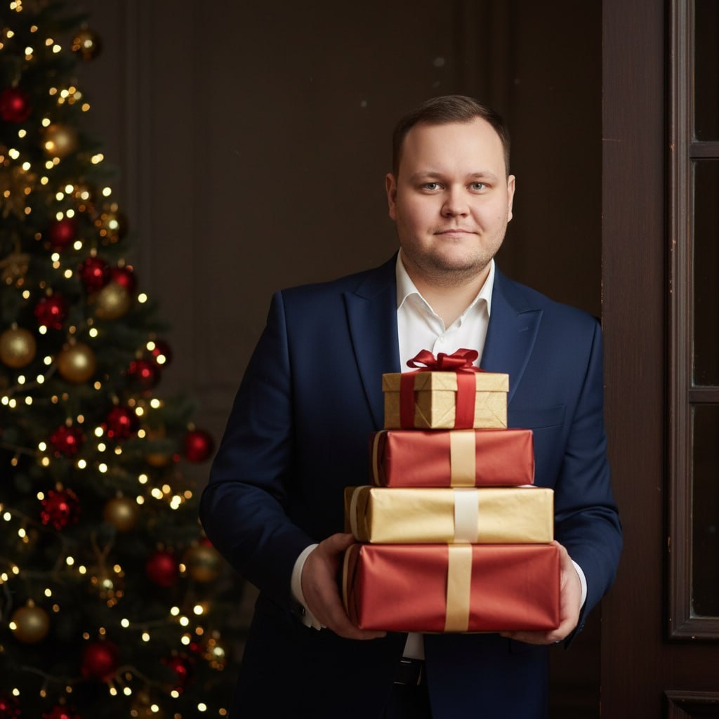 🔥 Загружаем свое селфи, закидываем промпт и получаем стильный праздничный портрет. Минимум мишуры, максимум эстетики и дорогого редакционного стиля. Идеально для тех, кто хочет праздничный контент без лишней суеты. ⚡️ Используя загруженное селфи как точный референс лица с полным сохранением всех черт и идентичности на 100%, создай фотографию по описанию, сохраняя абсолютное сходство лица. Элегантная зимняя интерьерная съемка в стиле редакционного фото. Мужчина [стоит в полный рост, корпус слегка развернут к камере]. Он [держит в руках несколько аккуратно сложенных коробок с подарками разного размера]. Поза спокойная и уверенная, голова и взгляд направлены прямо в камеру. Персонаж одет в [коричневый бархатный блейзер, темную рубашку без галстука, черные прямые брюки и черные ботинки]. Слева в кадре [нарядная новогодняя елка с золотыми и красными украшениями и теплыми гирляндами]. Фон слегка затемнен для создания глубины и уютной атмосферы. [Мягкое теплое интерьерное освещение], ровно