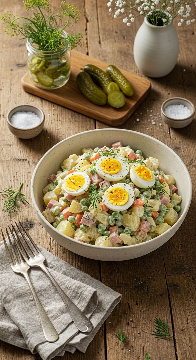 2. Объединяющая сила — Оливье готовится в большой миске, его хватает на всех. Это блюдо-символ единения семьи за праздничным столом.