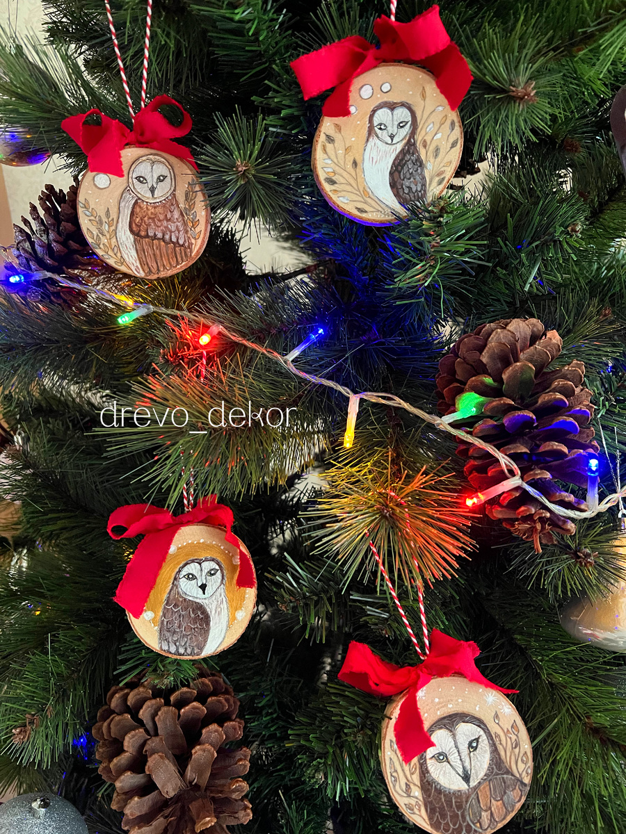 С радостью делюсь своим новым творением - уникальными елочными украшениями из деревянных спилов с совами! 🦉❤️