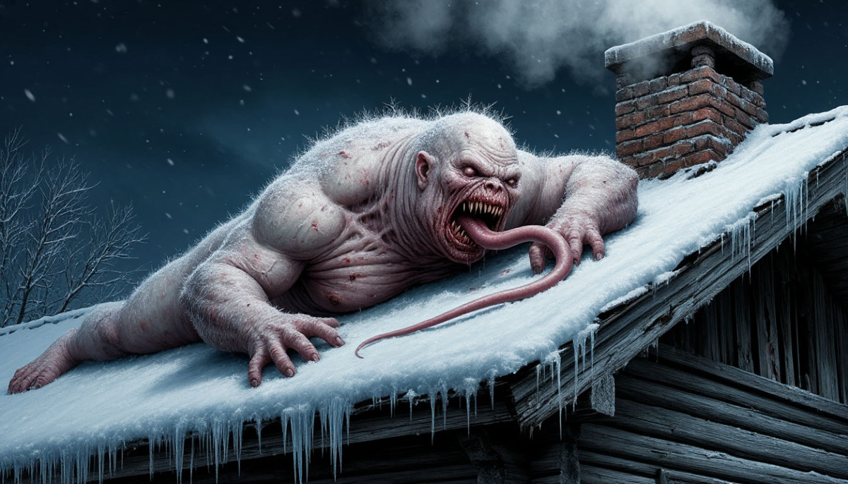 Серый, в инее. Рот растянут в черную дыру, из которой в дымоход уходит красная, замерзшая кишка.