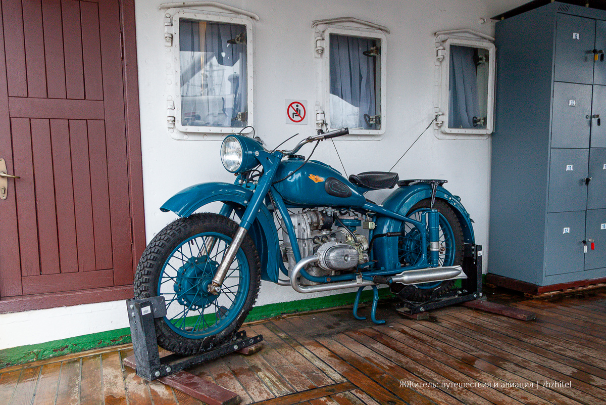 На научно-исследовательском судне «Витязь» на палубе стоит …мотоцикл. Несколько странно видеть это транспортное средство на судне. Оно, конечно, большое, но не настолько, чтобы гонять по нему на мотоцикле. Однако мотоцикл стоит не просто так. Научно-исследовательское судно «Витязь» участвовало во многих длительных экспедициях по всему миру. За время своей работы «Витязь» посетил 100 портов в 49 странах. На борту судна были члены экипаж и ученые. Им приходилось выполнять различные задачи не только в море, но и на берегу. От визитов к коллегам до закупки провизии. Для поездок на берегу на судне и был мотоцикл. Но это еще не все. Для более основательных поездок был еще и ГАЗ-69А. Такой автомобиль стоит сейчас рядом с «Витязем» на территории музея мирового океана. Оказывается, эти автомобили участвовали даже в арктических и антарктических экспедициях. Небольшая справка: