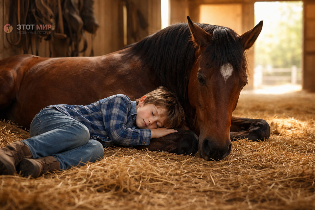 В глубине конюшни, в стойле, на свежей соломе, Джек спал. Сэм стоял рядом, словно часовой. Он повернул голову, когда вошла Алиса, и взгляд его был спокойным. Сильный, крепкий конь. Не тот жеребёнок.