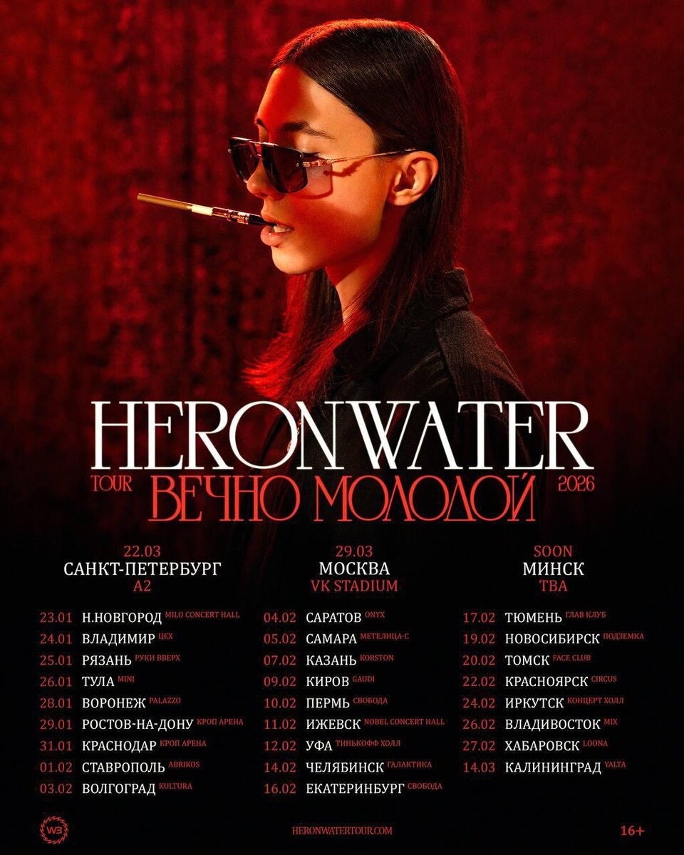 🎤 – Heronwater 📍 – 29 городов: Нижний Новгород, Владимир, Рязань, Тула, Воронеж, Ростов-на-Дону, Краснодар, Ставрополь, Волгоград, Саратов, Самара, Казань, Киров, Пермь, Ижевск, Уфа, Челябинск, Екатеринбург, Тюмень, Новосибирск, Томск, Красноярск, Иркутск, Владивосток, Хабаровск, Калининград, Москва, Санкт-Петербург, Минск 🗓 – 23 января 2026 – 29 марта 2026 (Минск — будет анонсирован позже) 💵 – от 1 500 руб. скидка по промокоду 1000bars 🔗 – билеты (16+) #концерты #билетынаконцерт #heronwater #вечномолодой #нижнийновгород #владимир #рязань #тула #воронеж #ростовнадону #краснодар #ставрополь #волгоград #саратов #самара #казань #киров #пермь #ижевск #уфа #челябинск #екатеринбург #тюмень #новосибирск #томск #красноярск #иркутск #владивосток #хабаровск #калининград #москва #санктпетербург #минск 👉 Список концертов: декабрь 2025 • январь 2026 @est_prohodka