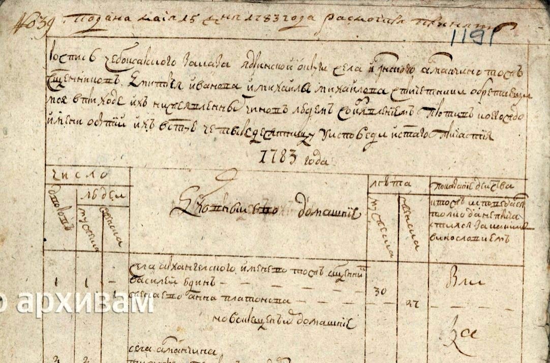 ГИА Чувашской Республики (ГИА ЧР), фонд № 225, опись № 7, дело № 4, стр. 2256 скан. Подана маия 25 дня 1783 года. Роспись Чебоксарского заказа Ядринской округи села Ильинского Алманчино тож священников Дмитрея Иванова и Михаила Михайлова с причетники обретающимся в приходе их нижеявленных чинов людем со изъявлением против коегождо имени о бытии их в Святую Четыредесятницу у Исповеди и Святого Причастия 1783 года. Духовные и их домашние. Села Архангельского Именево тож 1. Священник Василей Юдин. 30 лет. Жена его Анна Платонова. 27. https://yandex.ru/archive/catalog/67dd2c61-175a-42ea-ad03-dfeede773eb3/2256