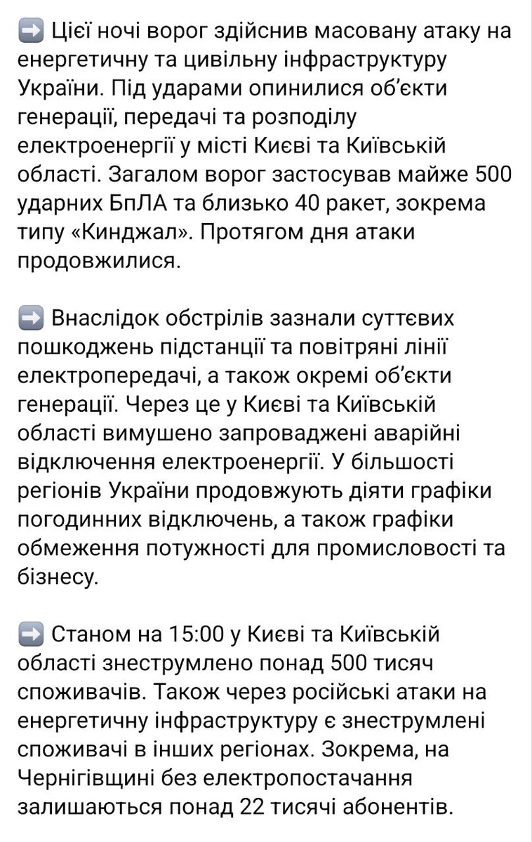 Минэнерго сообщает, что без электроснабжения в Киеве и Киевской области остаются более 500 тысяч абонентов