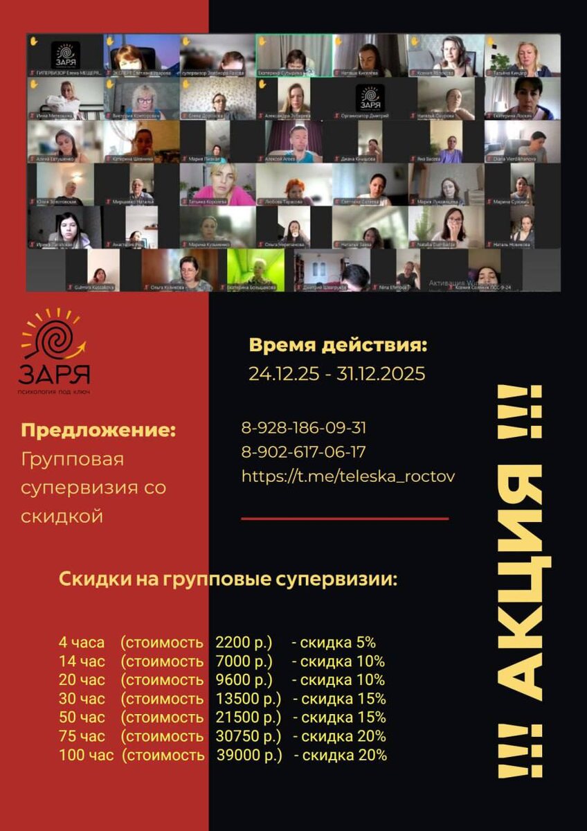 ! В первую очередь себе! Мы с коллективом супервизоров сообщества ЗАРЯ решили предложить нашим уважаемым коллегам сделать приятный вклад в свой профессионализм и успех в работе в виде бюджетных супервизий на весь год! Мы не знаем, как возрастут цены на следующий год и каков будет доход каждого из нас, но, мы гарантируем нашим уважаемым коллегам профессиональную поддержку в виде супервизий по ооочень бюджетной цене при покупке пакета на 2026 год до 31 декабря 2025 года! Стоимость абонементов по акции составит: -4 часа 2090 вместо 2200 руб. -14 часов 6300 вместо 7000 руб. -20 часов 8640 вместо 9600 руб. -30 часов 11450 вместо 13500 руб. -50 часов 18275 вместо 21500 руб. -75 часов 24600 вместо 30750 руб. -100 часов 31300 вместо 39000 руб. *при приобретении абонемента по акции бонусный час участия не добавляется. Все о нас здесь ⤵️ https://t.me/teleska_roctov