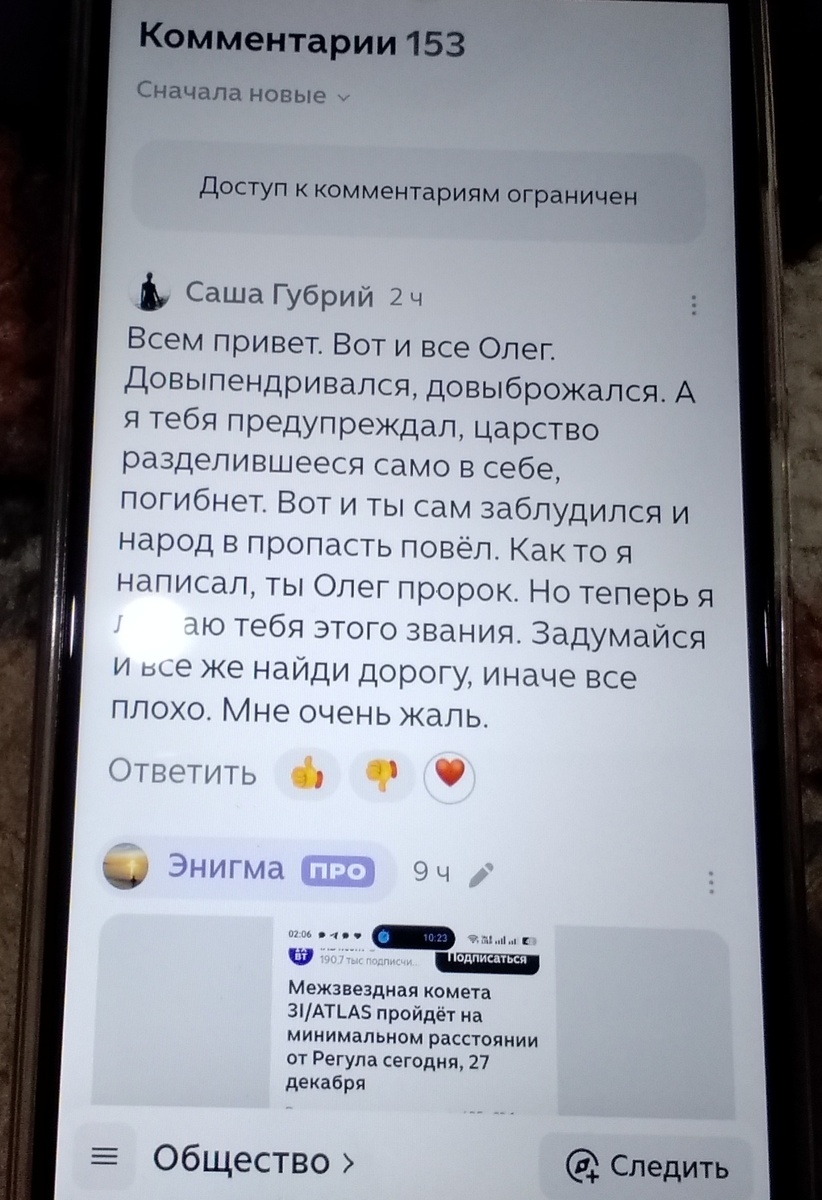 Всем привет, сегодня 28 Декабря 2025 года, я все же сдался напору и решил выложить сообщение в ОС, обращение к Олегу. Суть в чем, в том что уже как недели две у меня в голове крутится обращение к Олегу. Я категорически не хотел, сопротивлялся как мог. Но меня крепко очень прижали, прямо болеть начал. Вот сегодня уже не выдержал и с телефон выложил. И меня тут же заблокировали и сообщение было