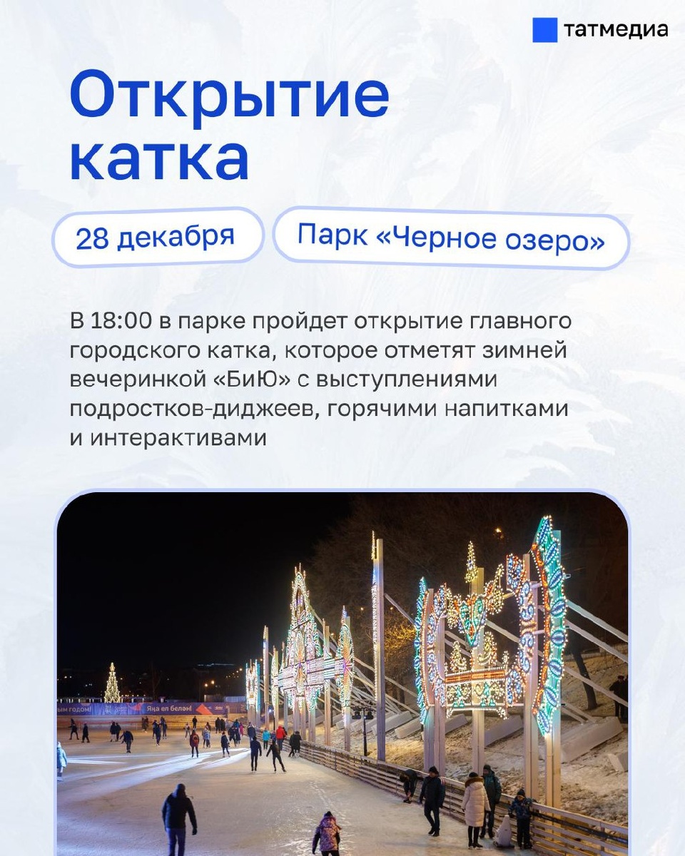 ⛸️❄️ В Казани откроется главный городской каток 28 декабря в парке «Черное озеро» состоится официальное открытие главного городского катка и пункта проката. В честь открытия пройдет первая зимняя вечеринка «БиЮ». В программе – сеты от подростков-диджеев, горячие напитки и интерактивы. Начало в 18:00. Для участия в активностях и получения скидки на прокат взрослых коньков потребуется регистрация по ссылке. @tatmediaofficial | Все каналы Татмедиа ™️ 1-й новостной MAX-канал Татарстана - подпишитесь.