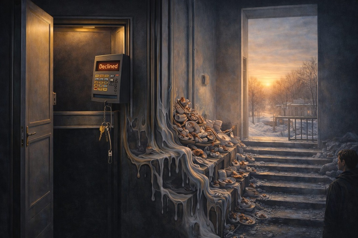 которая едва не съела выпавшую из моего кошелька карту. В последний момент я успеваю её схватить. Но кто знает — что было бы, если бы она упала? Мы зависаем в этом лифтовом междуэтажье, как в петле. Выйти нельзя. Оплатить невозможно.