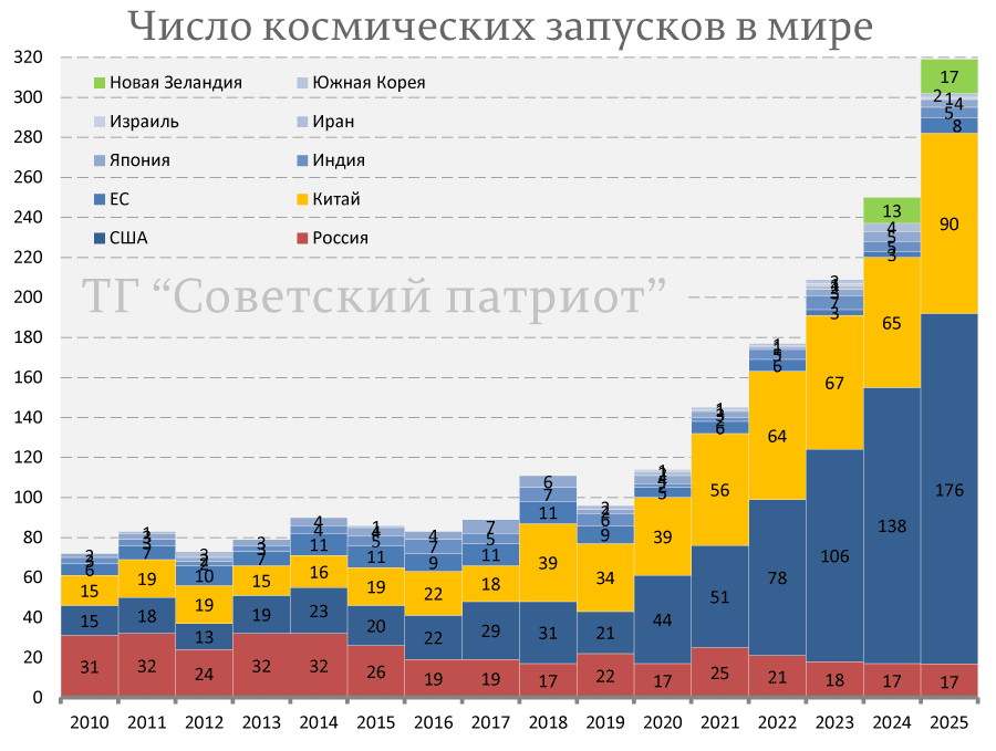 Поговорим о космических итогах 2025 года для России и всего мира. Ведь космос -- это та отрасль, которой мы когда по праву гордились, как первопроходцы и где мы всегда были первыми, либо одни из первых. Но что произошло после того, как к власти в нашей стране пришли т.н. эффективные менеджеры -- фанатики рынка, до сих пор считающие СССР отсталым и неэффективным государством, выпускавшим никому не нужные галоши? Оценим ситуацию с точки числа произведенных космических запусков по открытой статистике, данные которой я преобразовал в наглядную диаграмму: У России 17 запусков (худший показатель с 1961 года!) против 90 у Китая и 176 у США. Но что самое позорное: нас обогнала Новая Зеландия с территории которой в 2025 году тоже было произведено 17 пусков. В общем, мем про Юрия Гагарина, разговаривающего с потомками тут уместен, как нигде: Уважаемые подписчики, напоминаю, что канал "Советский патриот" существует только благодаря вашей поддержке, которую можно оказать лайками, перепостами или д