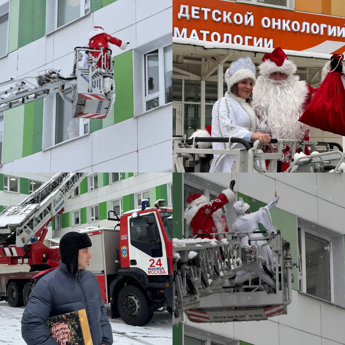 Конечно, речь не только обо мне, но и о коллективе "Мясо&Рыба", а также о неравнодушных людях из Управления по ЮАО Главного управления МЧС России по Москве, предоставляющих вышки, чтобы поднять Деда Мороза и Снегурочку к окнам палат Национального