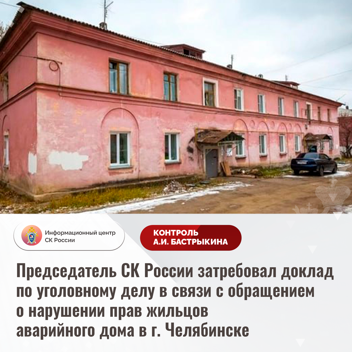 Председатель СК России затребовал доклад по уголовному делу в связи с обращением о нарушении прав жильцов аварийного дома в г. Челябинске В Информационный центр СК России поступило обращение по вопросу длительного нерасселения жильцов многоквартирного дома на улице Новороссийской в городе Челябинске. Двухэтажное здание 1948 года постройки находится в непригодном состоянии: несущие конструкции и потолочные перекрытия разрушаются, инженерные системы изношены, что приводит к регулярным коммунальным авариям и затоплению подвального помещения. Несмотря на признание строения аварийным в 2021 году, до настоящего времени благоустроенное жилье собственникам не предоставлено. Обращения в различные инстанции результатов не принесли. В СУ СК России по Челябинской области возбуждено уголовное дело. Председатель Следственного комитета Российской Федерации Александр Иванович Бастрыкин затребовал у и.о. руководителя СУ СК России по Челябинской области Константина Владимировича Правосудова доклад о пр