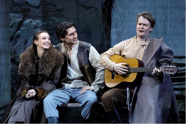 Получилась настоящая «гранд-оперá а ля советик»: четырехчасовой спектакль с двумя антрактами, который совсем не инновационен, но который интересно смотреть и который еще интереснее слушать. Работа хора и оркестра театра под управлением маэстро Гергиева отличается высоким качеством, слаженностью и вдохновенностью. Оркестровые вступления к картинам повергают в состояние транса своими неизбывными красотами, сочное пение хора – то мощное, то фольклорно-игривое – по-настоящему пронимает. Чувствуется, что для Гергиева эта партитура – особая, он знает про нее все и ведет коллективы и солистов на одном дыхании – страстно, живо, ярко, разнообразно по темпам и нюансам, по найденным звуковым образам и интонациям. В осенней серии за пульт встает его ассистент Антон Гришанин – звучание выходит точным, безукоризненным, но более сухим, чуть сдержанным.