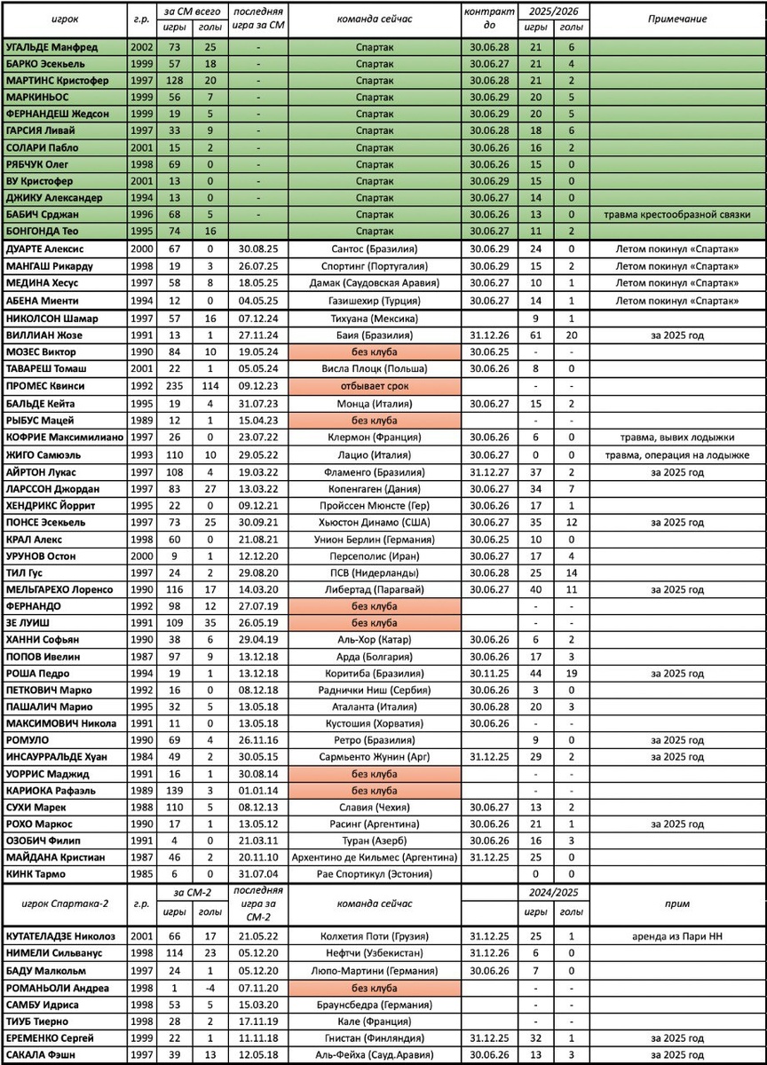 Начнём с бывших и нынешних легионеров "Спартака" в этом сезоне (для европейских чемпионатов) или в году (для Востока, обеих Америк и северных стран): 🗣 Из действующих спартаковцев "забойщики" в текущем сезоне: по играм - УГАЛЬДЕ, БАРКО и МАРТИНС (по 21 игре), по голам - УГАЛЬДЕ И ГАРСИЯ (по 6). 🗣 Из покинувших клуб летом более менее стабильно играют АБЕНА в Турции и МЕДИНА в Саудовской Аравии. 🗣 Теперь переместимся в Новый Свет. 61(!) игра за год у ВИЛЛИАНА, далее: РОША (44), МЕЛЬГАРЕХО (40), АЙРТОН (37). Педро РОША, кстати, переходит в "Коритибу", только что выведенную Сантосом МОЦАРТОМ в Серию А (правда, тренер у Педро будет уже другой). 🗣 ВИЛЛИАН и РОША лучшие и по забитым голам (20 и 19 соответсвенно). У ТИЛА - 14 мячей и окончание сезона впереди. Из "европейцев" отметим также ЛАРССОНА с 34 играми за половину сезона. 🗣 Завершил карьеру Луис АДРИАНО. 🗣 Без контрактов сейчас МОЗЕС, ФЕРНАНДО, Зе ЛУИШ, КАРИОКА и УОРРИС. РЫБУС расстался даже с медиафутболом. 🗣 Единственное