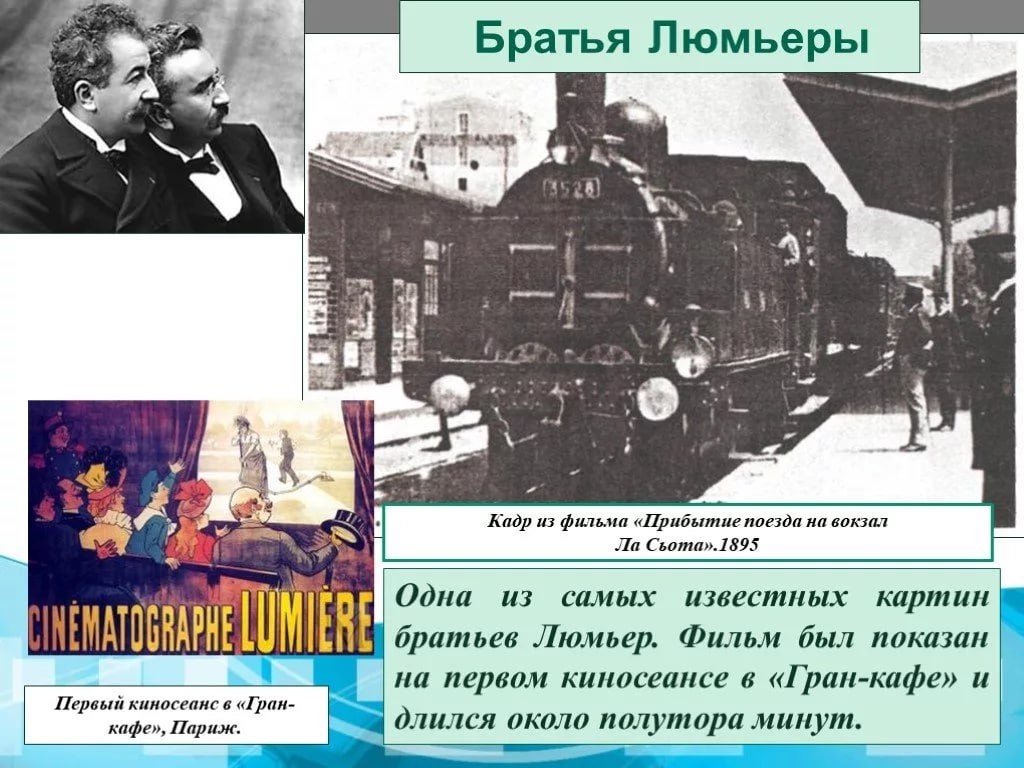 В 1895 году французские изобретатели Огюст и Луи Люмьер получили патент на изобретенный ими съемочно-проекционный аппарат «Синематограф». 28 декабря того же года, в парижском «Гран-кафе» на Бульваре Капуцинок, Люмьеры устроили первый в истории публичный просмотр программы своих фильмов: «Прибытие поезда на вокзал Ла Сьота», «Политый поливальщик» и другие. В России премьера состоялась 16 мая 1896 года в России показом короткометражных фильмов братьев Люмьер, в том числе «Прибытие поезда на вокзал Ла-Сьота». Премьера прошла в развлекательном саду «Аквариум» в Петербурге, показ длился 8 минут. Капибара |🔥Новости: 🙊 Я.Дзен: https://dzen.ru/newscapy 🙊 Телеграм: https://dzen.ru/id/651983a11cf2387b25169947