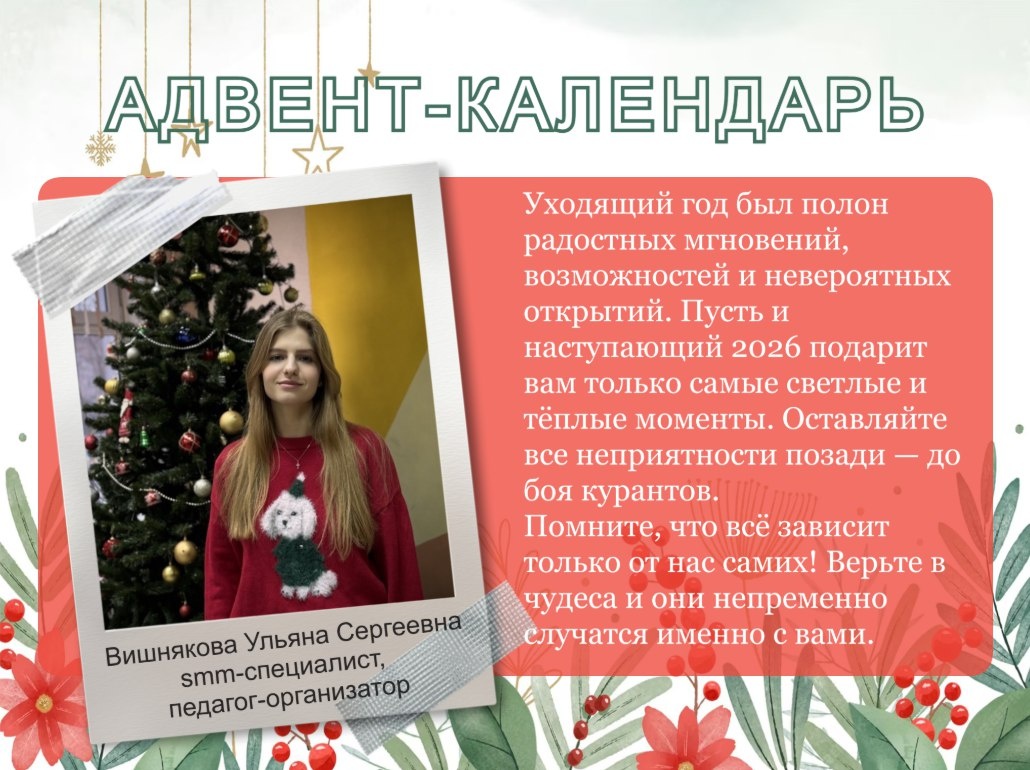 🎄 Сегодня получаем поздравления от Вишняковой Ульяны Сергеевны. А увидеть весь календарь можно по ссылке: https://vk.com/album-206909974_307859010 #ДОНМ #ШколыКолледжиМосквы
