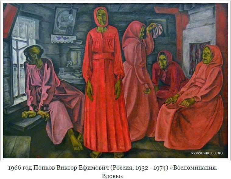Не питая больших надежд, он рассчитывал найти каноничную северную фактуру: строгий пейзаж, плотницкие избы, неторопливых жителей. Но в деревне, квартирусь у местной старушки, художник познал совсем иной север. Ночами, при керосиновой лампе, женщины вспоминали, как ушли их мужья сначала на Финскую, потом на Великую Отечественную, как не вернулись сыновья, как зарастал колхозный двор, пока они в одиночку тянули волок. Эти «бабьи посиделки» оглушили Попкова. Он писал позднее, что перед ним были люди, у которых война не кончилась, и ни колхозные грамоты, ни партийные лозунги не были способны ничего изменить. Так появилась идея цикла «Мезенских вдов». Советский художник словно подошел к границе иконописи. Вертикальные силуэты, широкие станы, лица без мимики, напряжённый, почти свечной свет. Фигуры то выстраиваются строгим фронтоном («Воспоминания. Вдовы»), то складываются в хор («Северная песня»), а повторы задают ритм. Попков никогда не подражал народному искусству буквально, его живопи