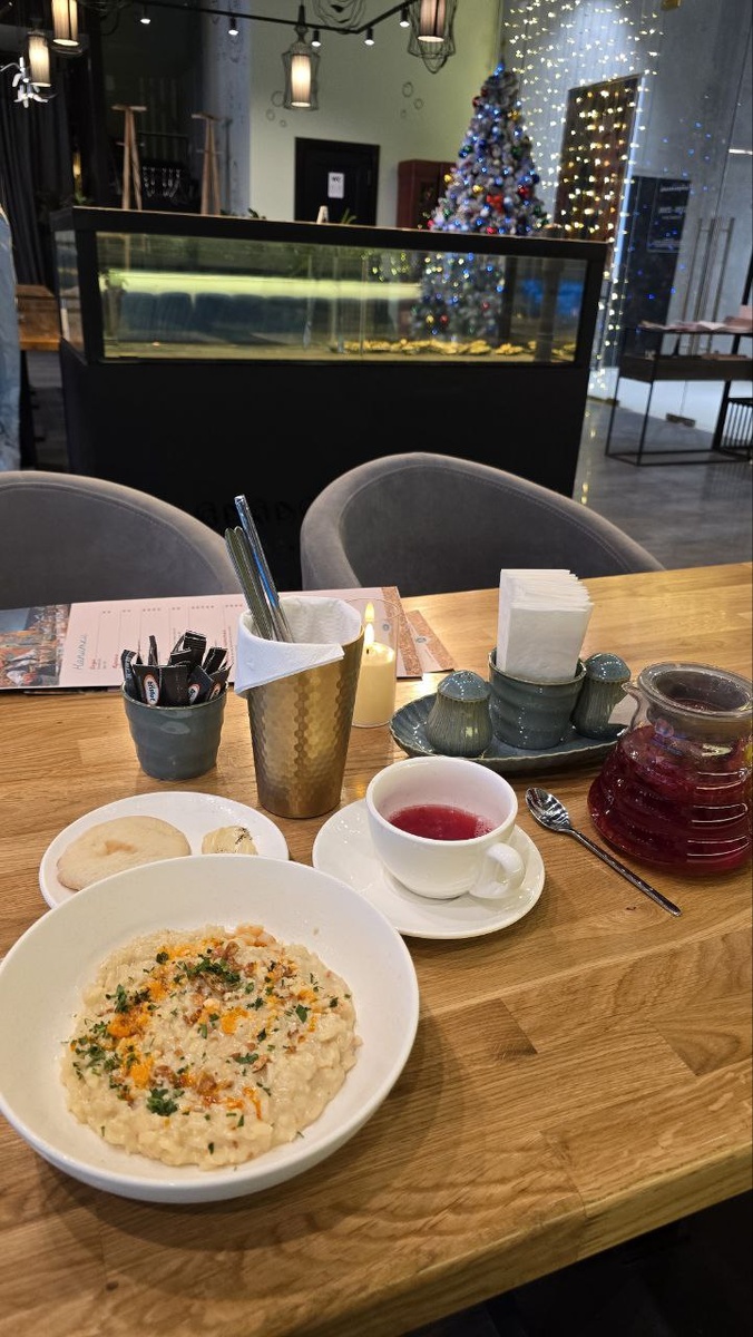 После всего этого они меня должны были забрать. Но маник перенесли, я внезапно освободилась раньше и мне надо было как-то добраться до дома. Посмотрела такси. Я говорила, что боюсь ездить с таксистами? Я не доверяю другим водителям. 🤷 650р Посмотрела каршеринг. Это всегда мой выбор, когда машина не со мной. 250 рублей. Выбор очевиден! Я же не транжира какая-то там и тем более фобию имею! Поэтому совершенно очевидно, что из предложенных вариантов добраться до дома (можно было ещё пройти пешком абсолютно бесплатно) я выбрала пойти обедать в новый, только-только открывшийся ресторан 🤌 Взяла ризотто с морепродуктами, панакоту с черникой и щавелем и малиновый чай. Сижу жду, когда меня заберут, листаю канальчики в тележке. После обеда официантка принесла печенье с предсказанием. Мне выпал подарок - согревающий напиток. Можно было выбрать любой чай (я б уже булькала от второго чайника чая). Я выбрала безалкогольный глинтвейн. Тоже абсолютно логично! Когда не любишь глинтвейн - выбирай и