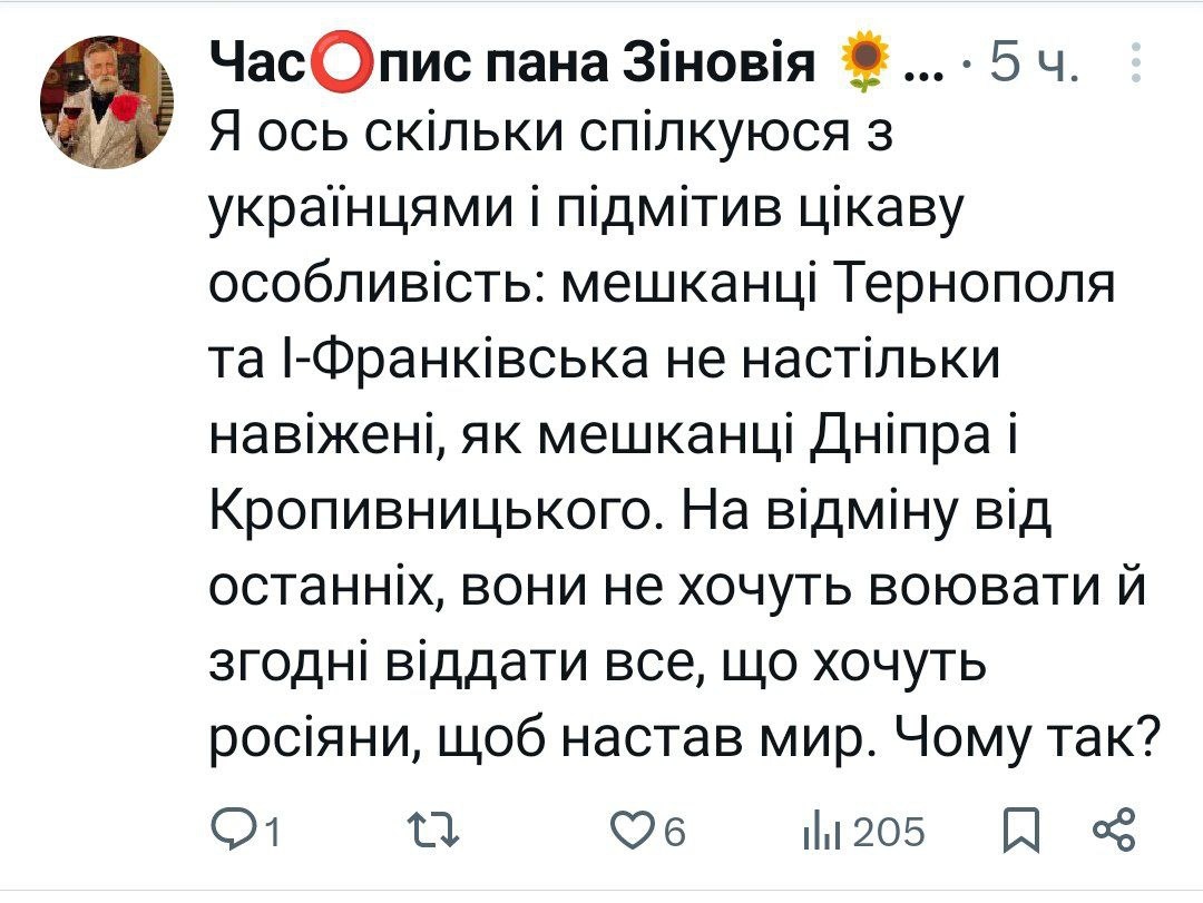 Я вот сколько общаюсь с украинцами и подметил интересную особенность: жители Тернополя и Ивано-Франковска не настолько упоротые, как жители Днепра и Кропивницкого. В отличие от последних, они не хотят воевать и согласны отдать все, что хотят русские, чтобы наступил мир. Почему так?