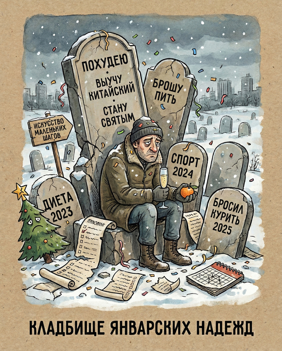 Каждый январь мы просыпаемся с головной болью и списком ультиматумов к самому себе. «Похудею», «выучу китайский», «стану святым». А уже к марту тихонько заметаем эти списки под ковер. Делаем вид, что этого никогда не было. Коллективная амнезия. Психологи (люди дотошные) изучили три тысячи мечтателей и выяснили неприятную правду: Только 12% реально выполняют свои новогодние обещания. Остальные 88% — просто сотрясают воздух. В чем дело? В силе воли? В слабой ауре, как любят говорить эзотерики? Нет. Проблема в «битой» прошивке самих обещаний. Мы ставим цели, а жить пытаемся ценностями. Смотрите на пальцах: Диета — это цель. Это тюрьма строгого режима. Сорвался один раз, съел печеньку — всё, расстрел, я безнадежен. Забота о себе — это ценность. Один плохой день её не отменяет. Ну съел и съел. Завтра поем нормально. Цели ломаются от первой трещины. Ценности переживают любые сбои. Мозг — древнее животное. Эволюция заточила его на то, что приятно прямо сейчас. Ему плевать на вашу «долгосрочну