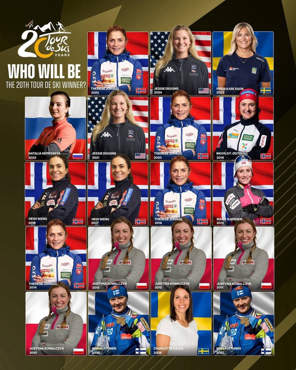 Победители за 19 лет многодневки Женщины Норвегии - 8 Польша -4 СГА -2 Швеция -2 Финляндия -2 Россия -1 Больше всего индивидуальных побед у Юстины Ковальчик и Терезы Йохауг - по 4. Мужчины Норвегия -8 Россия -4 Швейцария -4 Чехия -2 Германия -1 Больше всего индивидуальных побед у Дарио Колонья и Йоханнеса Клебо- по 4 Фотографии https://www.instagram.com/p/DSvJ1gmjA57/
