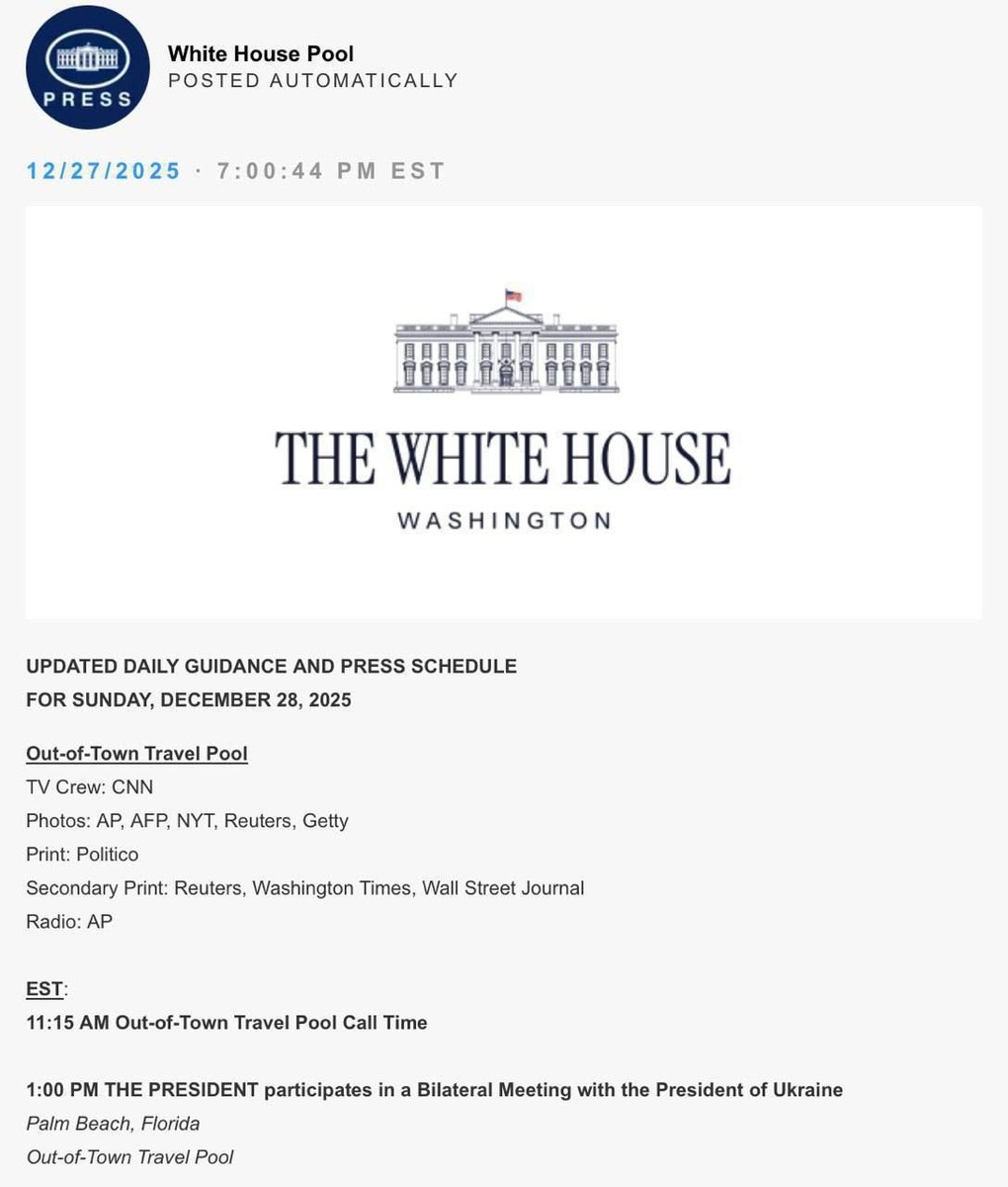 Oq uyning ma’lum qilishicha, ikkala davlat rahbarlarining 28-dekabrga belgilangan uchrashuvi vaqti o‘zgartirilgan. U dastlab mahalliy vaqt bilan soat 15:00 ga belgilangan edi. Keyinroq 13:00 ga (Toshkent vaqti bilan 23:00 ga) ko‘chirilgan. @daryolive