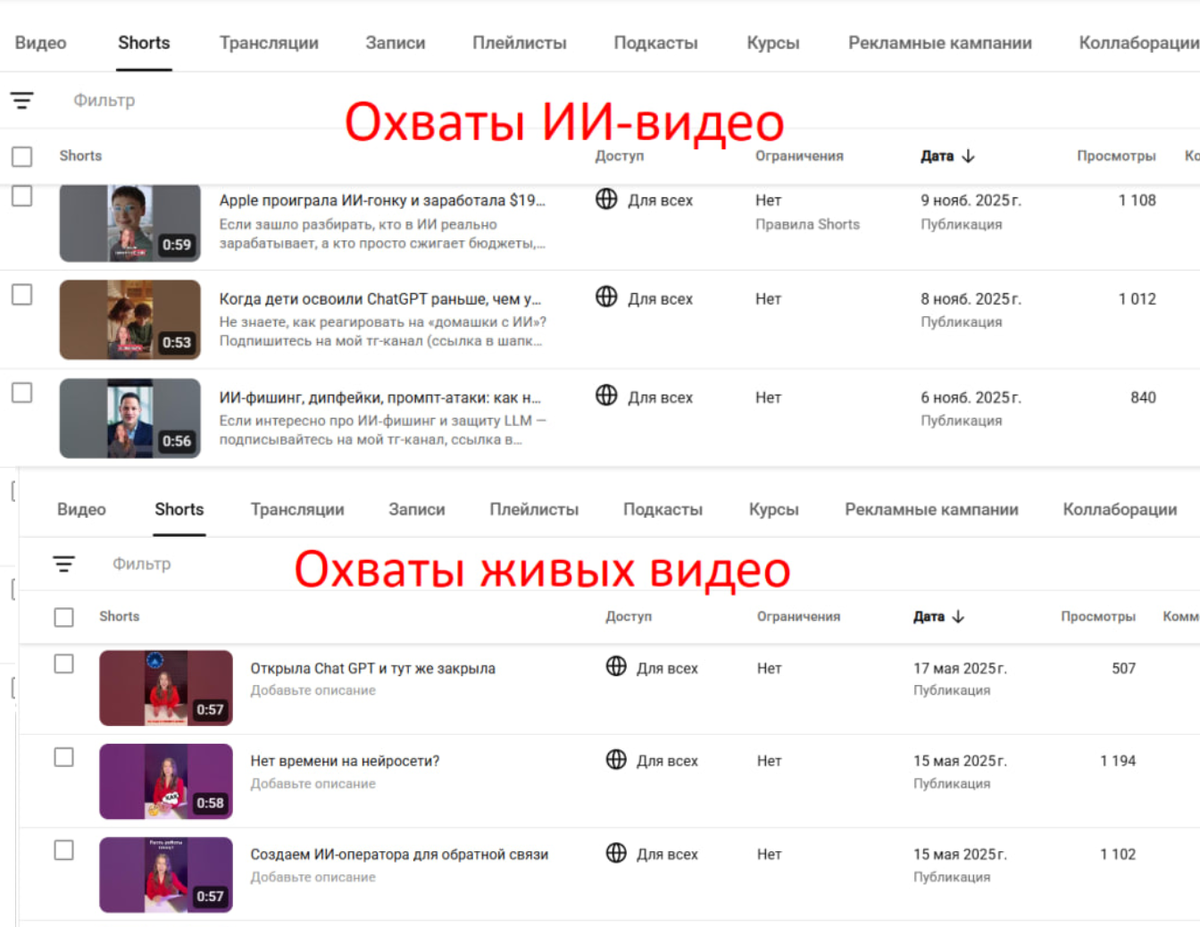 Я много экспериментировала с короткими видео — и с живыми, и с ИИ. И пока реальность выглядит так: ИИ видео смотрят не лучше, но и не хуже.