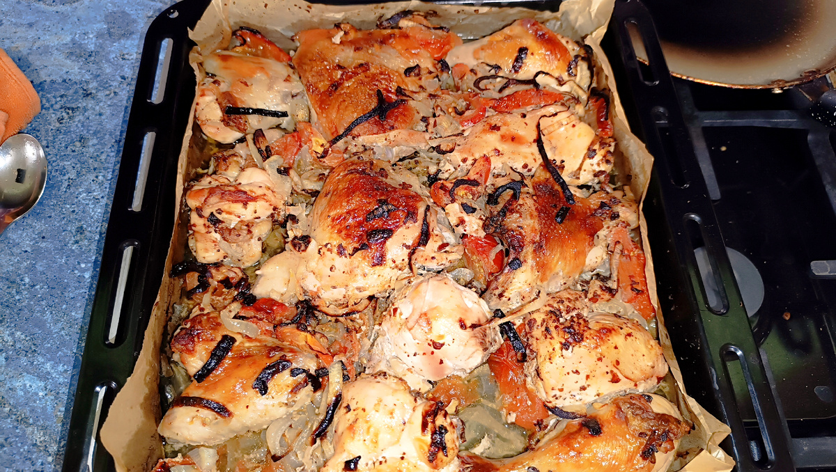Все эти кусочки тщательно перемешал и дал им постоять пару часов. Сейчас курица уже в духовке, температура выставлена на 180–190 градусов.