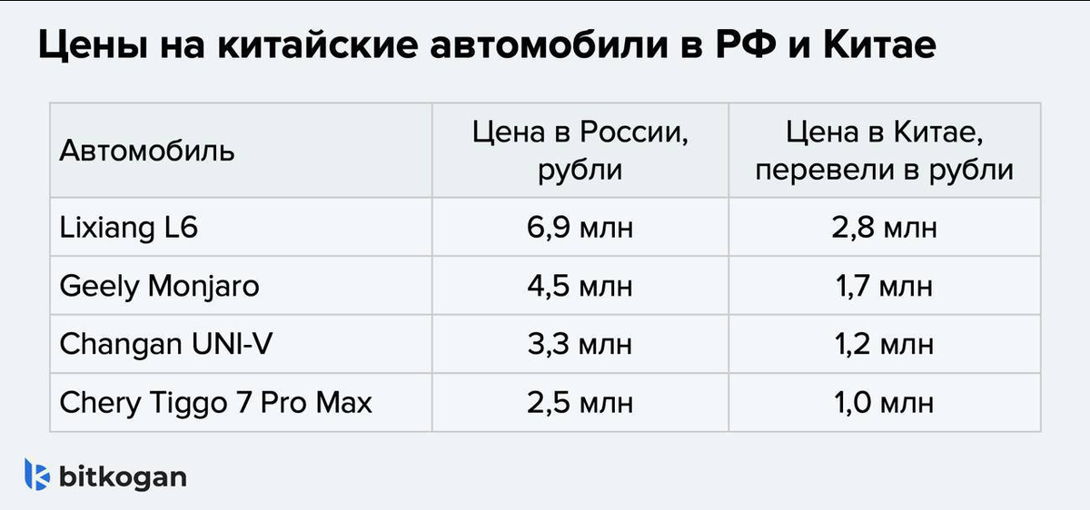Простой ответ: еще больше подорожают с начала следующего года. Но будут ли их покупать с такими наценками? Мы сравнили цены на автомобили, по которым они продаются в Китае (рекомендованная производителем цена на стартовую комплектацию, без учета скидок), с их начальной стоимостью в России (на автомобильном маркетплейсе). В рейтинг не вошел бестселлер Haval Jolion, т.к. для китайского рынка его перестали выпускать в 2021 году. Так вот разница в ценах, как видите, огромная — и это у нас еще рубль крепкий. Чем дальше повышают утильсбор, тем дороже для российского покупателя китайский автомобиль. ▪️Но давайте посмотрим на ситуацию с китайской стороны. В Китае уже 3 года как падают цены на авто: на 10–15% на авто с ДВС и до 30% на электромобили за 3 года. Внутри страны конкуренция бешеная. Пытаясь удержать рынок, компании режут себе маржу. Дошло до того, что власти страны вышли и сказали: мол, конкуренция уже вышла за грани здравого смысла, прекратите (!) снижать (!) цены (!) на автомобили