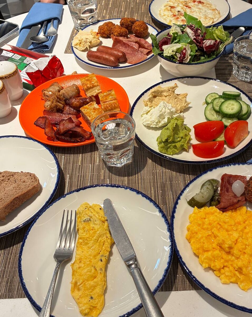 ). В нашем отеле на завтрак решили подавать блюда из свинины. А в исламской стране для это необходимо соблюдать ряд строгих правил. У отеля должна быть лицензия. Отдельно организованы места для готовки и отдачи такой пищи. И всегда есть вероятность получить недовольство ортодоксальных потребителей халяля. В общем, для отеля это вызов, и в нашем его приняли. На входе посетителей сразу информировали об этом. Перед зоной шведского стола обозначили ленточками место выдачи с тарелками ярко оранжевого цвета. С ними нельзя проходить к остальным блюдам. (персонал может доставить еду к твоему столу). Буфет и без свинины ломился от еды, но мы из уважения к усилиям персонала оказали честь 🐽. Продукт качественный, приготовлено вкусно. Разве что бекон немного суховат без жировой прослойки, ближе к чипсам. Стафф подходил к нам и вежливо с улыбкой (они там обаятельные) просил рецензию на эти блюда. Приятно. Как потом оказалось, оранжевые тарелки присутствовали на многих столах. ⠀ Этот пост не