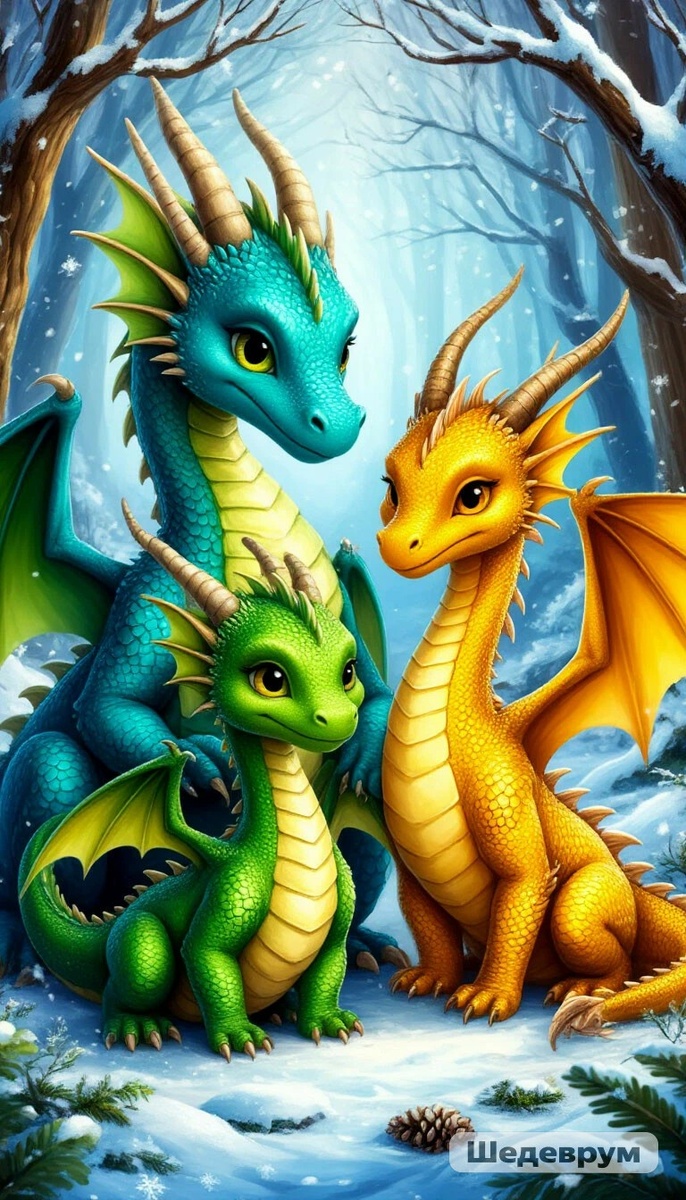 Но в этом году подарок был особенным. Ещё утром Дракоша почувствовал знакомое, родное щемление в сердце — то самое, что бывало перед прилётом родителей. Он выбежал на порог пещерки и увидел, как с неба, стремительно и ловко рассекая воздух, пикируют два драконьих силуэта.