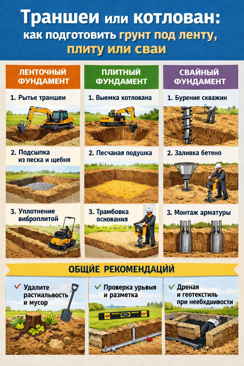 — бетон залили “в грязь”… И фундамент ещё не начался, а проблемы уже куплены. Давайте разложу по-человечески: как готовят грунт под ленту, плиту и сваи так, чтобы потом не спорить с трещинами. Запомните фразу, которая экономит нервы: Экскаватор делает яму. Фундамент начинается там, где вы сделали правильное дно. И вот дно — это самое важное. Лента — это когда вы копаете не “в общем”, а точно под несущие стены. 1) Копают заранее.