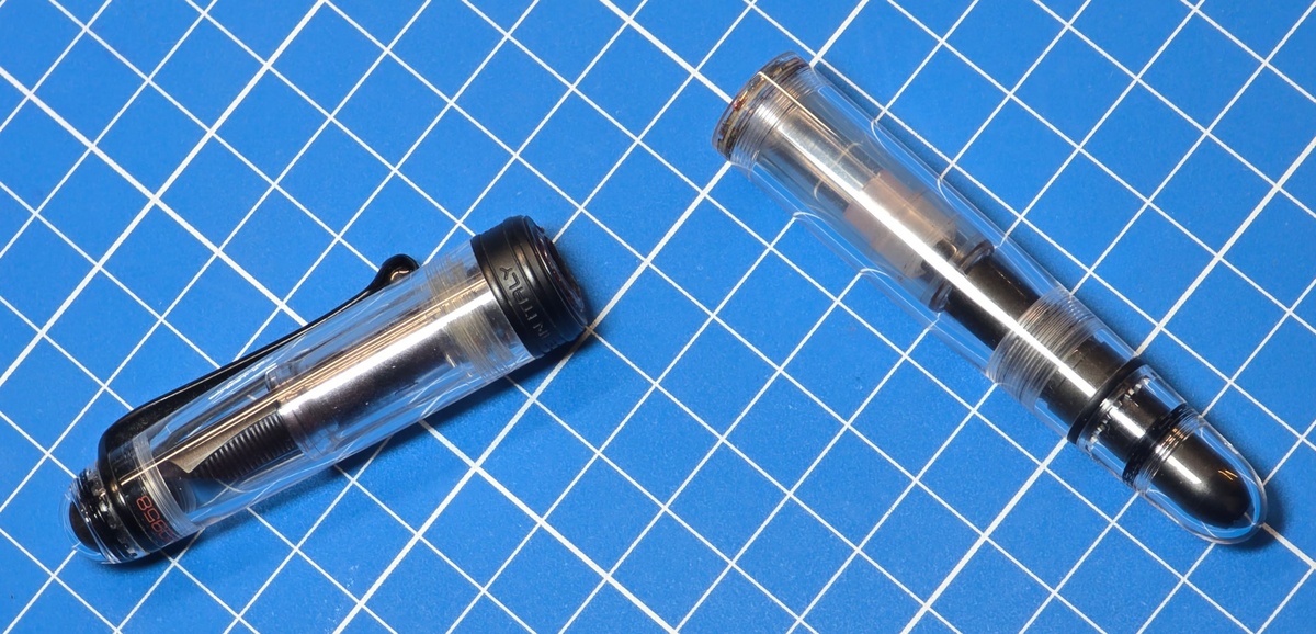 Коллеги знают, что я регулярно ругаю ручки Aurora за их паталогическую склонность к саморастрескиванию, причем это в данном случае не страшилки из интернета, а личный опыт. Несколько десятков таких держал в руках, часть из них ремонтировал... А еще они знают, что я не очень жалую демонстраторы (привет TWSBI и Pilot 823), причем по той же причине, при прочих равных прозрачный пластик гораздо более хрупкий. А тут прям страйк - демонстратор от Aurora. Признаюсь, когда ко мне обратились по вопросу ремонта данной ручки, я был настроен крайне скептически, но очень уж она оказалась дорога хозяину. История поломки весьма тривиальна "не гнул, не ронял, она сама треснула лежа на столе". Причем тут нет лукавства, ручки Aurora именно так и делают зачастую( Интересный момент был в том, что невозможно было просто взять и сопоставить обломки, между ними была щель около 0,2 мм. То ли пластик "сел" со временем, то ли настолько внатяг закручено было - загадка. В любом случае, чтобы качественно все прок