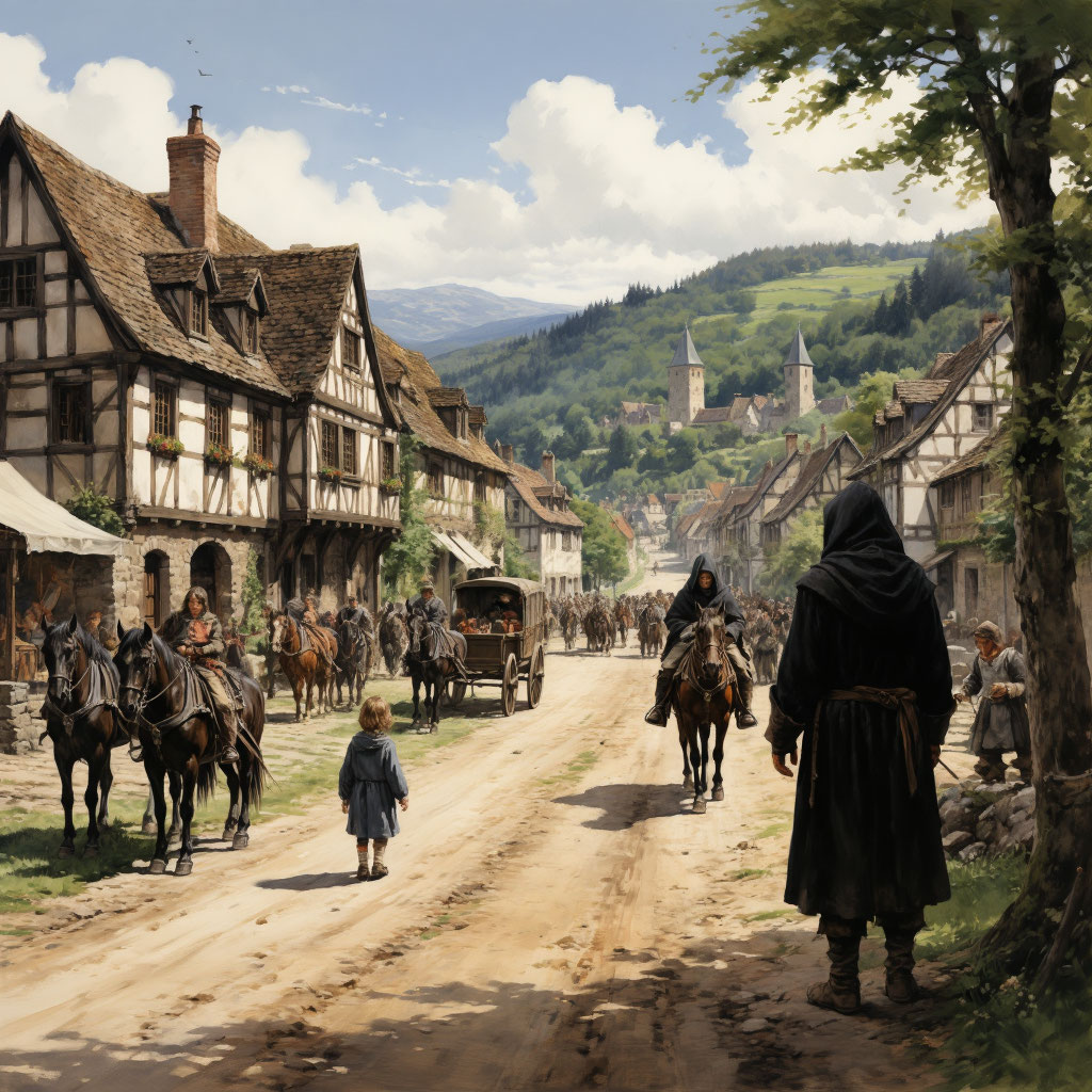 Тракт кишел жизнью. Повозки, лошади, люди в грубой одежде, торговцы с корзинами, один солдат на обочине, который смотрел на всех так, будто он хозяин мира, но сапоги у него были изношены и дырявы.