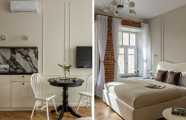 В этой петербургской квартире каждый метр работает на ощущение комфорта Студию площадью 30 м² в Санкт-Петербурге дизайнер Екатерина Шейн оформляла для сдачи в аренду с учетом жестких инженерных ограничений и необходимости разместить все базовые функции. Важным было сохранить исторический характер пространства, не перегрузив его мебелью и декором. В итоге интерьер получился компактным и логичным, а многие решения легко адаптировать и для других небольших квартир. Кухню разместили на входе в комнату, а не в прихожей, чтобы она воспринималась логично и не выглядела сервисной зоной. Решение помогает сохранить ощущение цельного пространства: кухня не доминирует, а аккуратно встроена в сценарий жизни. Кухонные блоки выполнены уменьшенной глубины — от 35 до 50 см, что позволило сохранить комфортные проходы и не съедать полезную площадь, и при этом функциональность кухни не пострадала. Между кухней и зоной отдыха появилась стена, которая не перекрывает свет, но четко разделяет функции: она пом
