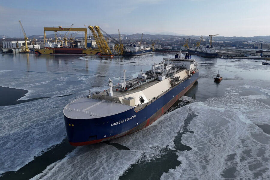 Ледокольный танкер-газовоз «Алексей Косыгин» начал своё первое плавание по Северному морскому пути, выйдя из бухты Большой Камень, расположенной в Приморском крае. Как сообщили в пресс-службе Судостроительного комплекса «Звезда», этот уникальный корабль успешно проходил испытания и был передан ПАО «Совкомфлот» для участия в проекте «Арктик СПГ-2». Источник изображения: Пресс-служба «Роснефти» «Алексей Косыгин» стал первым судном в серии ледокольных танкеров, которые строятся на данной верфи. Его ледовый класс ARC 7 позволяет ему уверенно пробивать лед толщиной до двух метров. Объём сжиженного природного газа, который он может перевозить, составляет 172 тысячи кубометров. Данная модель имеет длину 300 метров и ширину 48,8 метра, а её дедвейт равен 81 тысяче тонн. Судно также оснастили мощной силовой установкой на 60 мегаватт.