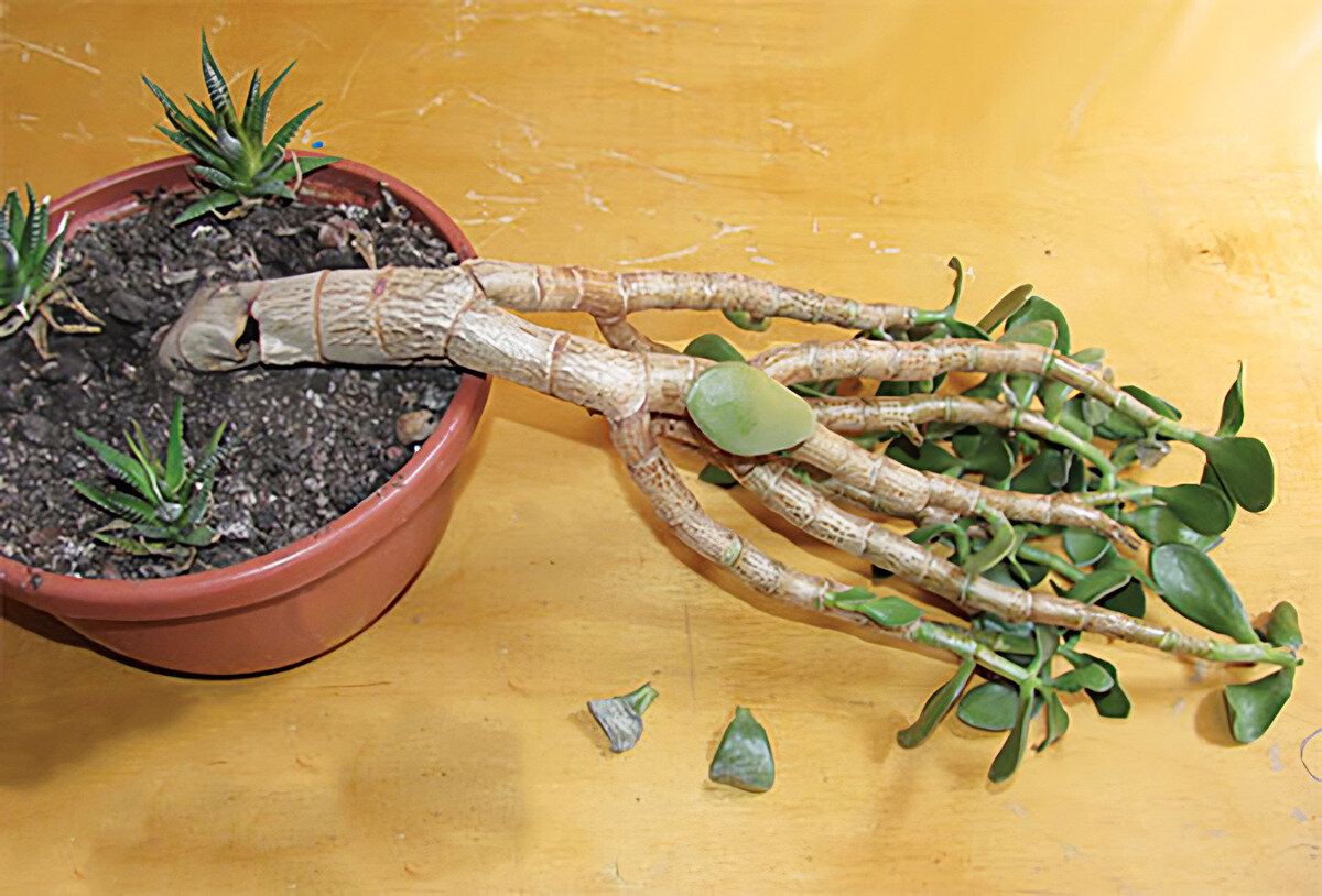 Корневая система здоровой толстянки, я бы не сказал, что слабая, скорее, состоящая из множества тонких корней. Но они полностью оплетают земляной ком и имеют темно-коричневый цвет.