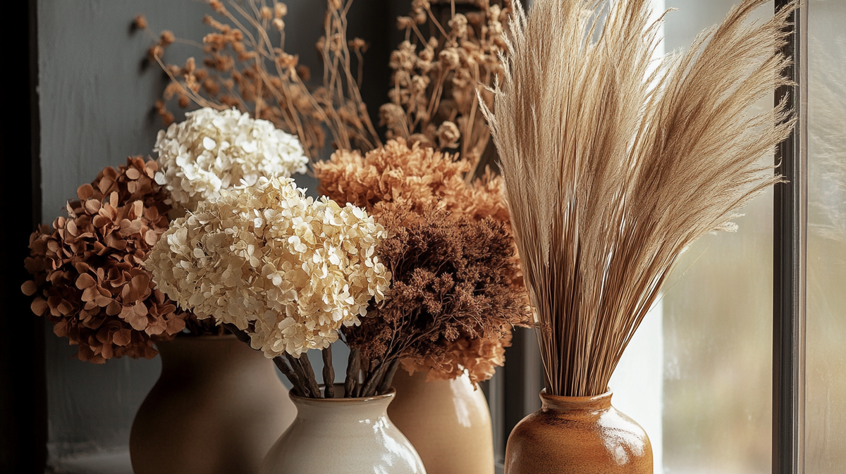 Масштаб имеет значение. В высокой гостиной — композиция до 1,5 м. В маленькой — горизонтальные букеты, визуально расширяющие пространство. Цвет либо вписывается в общую палитру, либо создаёт осознанный контраст. В минимализме — сухоцветы в прозрачных сосудах, ничего лишнего. В классике — пышные букеты в хрустальных вазах, подчёркивающие торжественность.