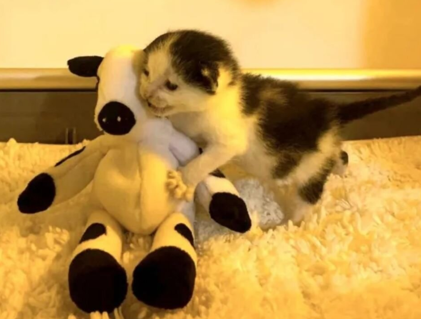 В шкафу лежала мягкая пятнистая коровка — подарок от благотворителей. Аня долго смотрела на неё, потом на котёнка. Расцветка игрушки удивительно совпадала с пятнышками малыша. "Может быть... может быть, это судьба?" — подумала она и осторожно положила коровку рядом с котёнком. То, что произошло дальше, Анна запомнила навсегда. Котёнок, который до этого лежал безучастно, вдруг повернул головку к игрушке. Принюхался. Осторожно тронул лапкой. А потом малыш прижался к коровке всем своим крошечным тельцем и впервые заурчал. Это урчание было слабым, прерывистым, но настоящим. В нём было столько облегчения, столько благодарности, что Аня почувствовала, как по щекам текут слёзы. "Вот и познакомились, — прошептала она. — Теперь ты не один, малыш."