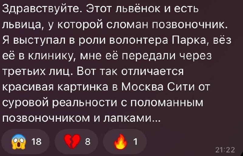 Содержание таких животных запрещено у частных лиц, где он взял бедного львёнка, и как ужасно с ним обращался. Этот блогер должен понести наказание, напишите все заявления а прокуратуру Москвы https://epp.genproc.gov.ru/ru/proc_77/internet-reception/personal-receptionrequest/, с требованием провести проверку! Инструкции https://disk.yandex.ru/i/SnCck4GVV4NaMw https://disk.yandex.ru/i/AgqTV-K9vBj3yw Московский блогер завёл львёнка для хайпа в соцсетях — животное уже изъяли с переломами хвоста и позвоночника «Долларовый миллионер» снимал роскошную жизнь льва: катание на дорогих тачках, проживание в Москва-Сити и даже поиск няни для питомца. Сейчас животное находится на интенсивном лечении. Прогнозы остаются осторожными, так как кости у малыша крайне хрупкие. #gbrzoo #gbrzoopomosh