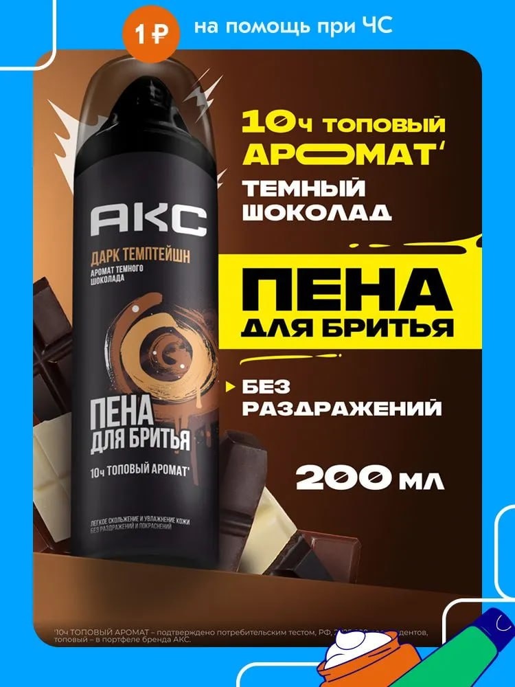 Пена для бритья для мужчин увлажняющая Акс Дарк Темптейшн – это идеальное косметическое средство для ухода за кожей с топовым* запахом темного шоколада, разработанное для взрослых мужчин и подростков с 14 лет с любым типом кожи лица. Формула средства обогащена питающими и увлажняющими компонентами, для того чтобы процесс бритья и твой день прошли гладко. 💸 276 руб. 😁 https://ozon.ru/t/rdqu8uF