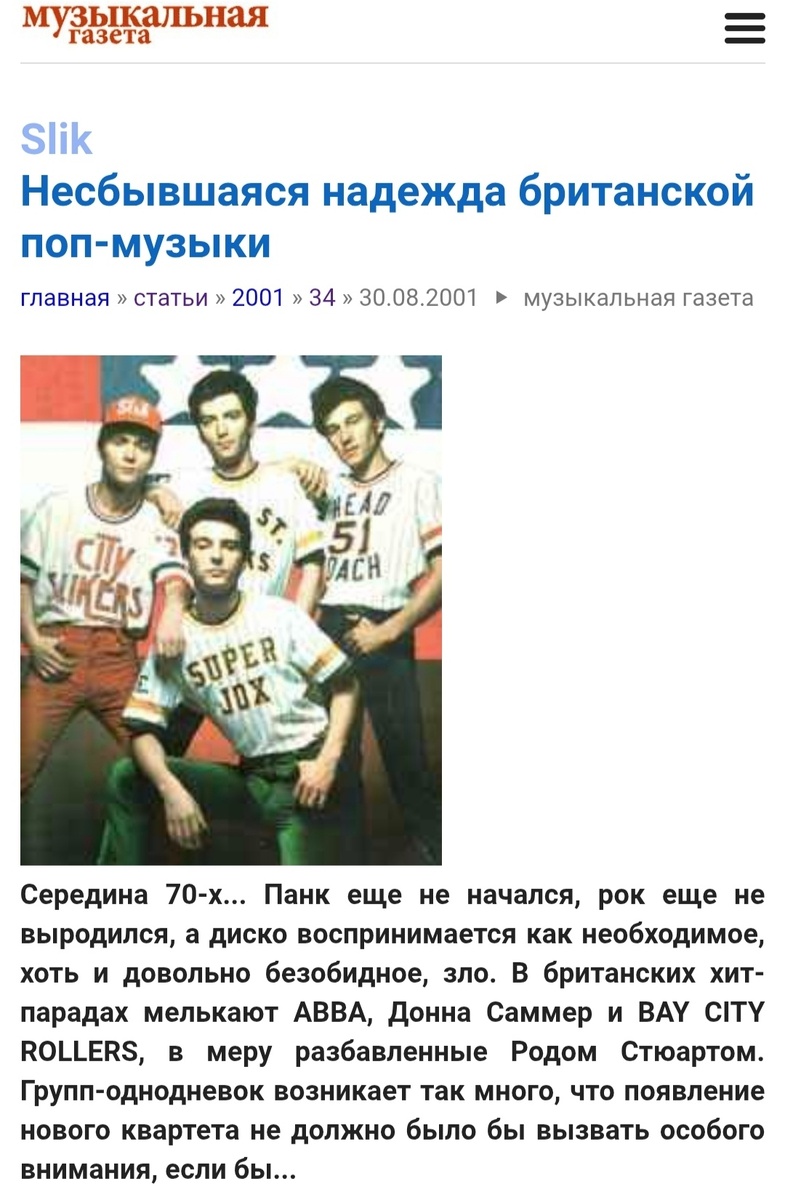 Настоящая статья, написанная мной для "МГ. Музыкальной газеты" (Минск), была опубликована в 34-м номере от 30 августа 2001 года. Не уверен, что она будет интересна нынешнему поколению, да и меломаны-"ветераны", возможно, с трудом припомнят группу, о которой пойдёт речь - если вообще при помнят. Конечно, вряд ли Slik достигли бы успеха "роллингов" или Slade, но вот подвинуть со своего пьедестала Bay City Rollers вполне могли бы (помните, был такой термин - "роллермания", по аналогии с "битломанией" и "слейдоманией"?). На волне популярности Slik даже удостоились собственной биографии, которая имеется в моих архивах (купил за границей). Благодаря этой книге и стала возможной данный материал.